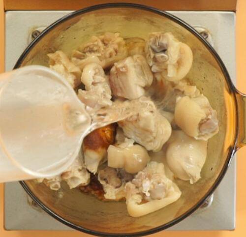 4、加料酒、老抽,倒清水没过猪蹄。