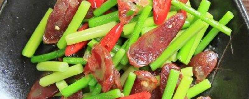 1、准备食材:腊肠3根、蒜苔200克、油适量、盐1勺、生抽1勺、蚝油1勺、葱适量。