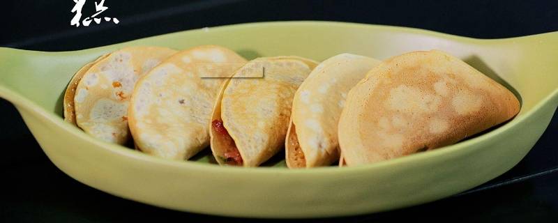 4、待面中间干后,放入1克化猪油,再放入4克调制好的甜馅,最后用夹子将锅中的糕的一边提起,将糕夹折成半圆形,再翻面烤成金黄色即成。