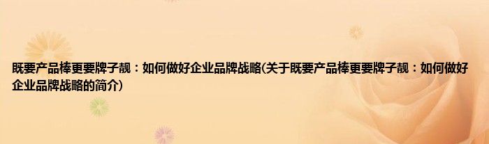 本文关于既要产品棒更要牌子靓:如何做好企业品牌战略的简介就讲解完毕,希望对大家有所帮助。