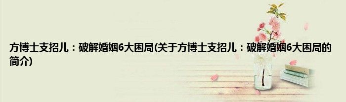 本文关于方博士支招儿:破解婚姻6大困局的简介就讲解完毕,希望对大家有所帮助。