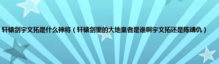 大家好,小常来为大家解答以上问题。轩辕剑宇文拓是什么神将,轩辕剑里的大地皇者是谁啊宇文拓还是陈靖仇很多人还不知道,现在让我们一起来看看吧!