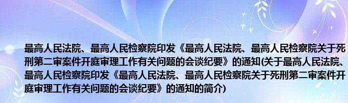 大家好,最高人民法院、最高人民检察院印发《最高人民法院、最高人民检察院关于死刑第二审案件开庭审理工作有关问题的会谈纪要》的通知,关于最高人民法院、最高人民检察院印发《最高人民法院、最高人民检察院关于死刑第二审案件开庭审理工作有关问题的会谈纪要》的通知的简介很多人还不知道,现在让我们一起来看看吧!