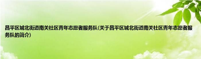 1、 昌平区城北街道南关社区青年志愿者服务队是由昌平区城北街道青年志愿者服务队领导下的志愿团体。