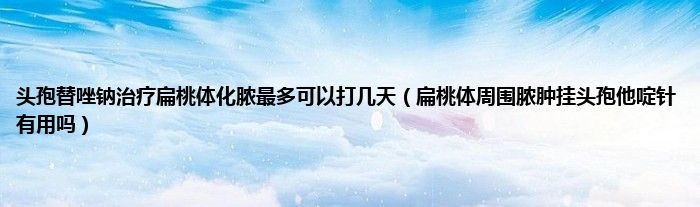 大家好,头孢替唑钠治疗扁桃体化脓最多可以打几天,扁桃体周围脓肿挂头孢他啶针有用吗很多人还不知道,现在让我们一起来看看吧!